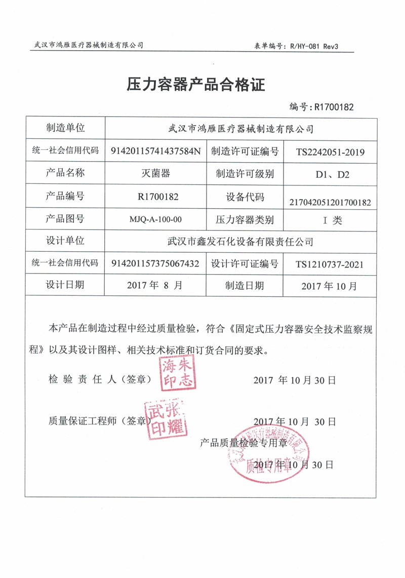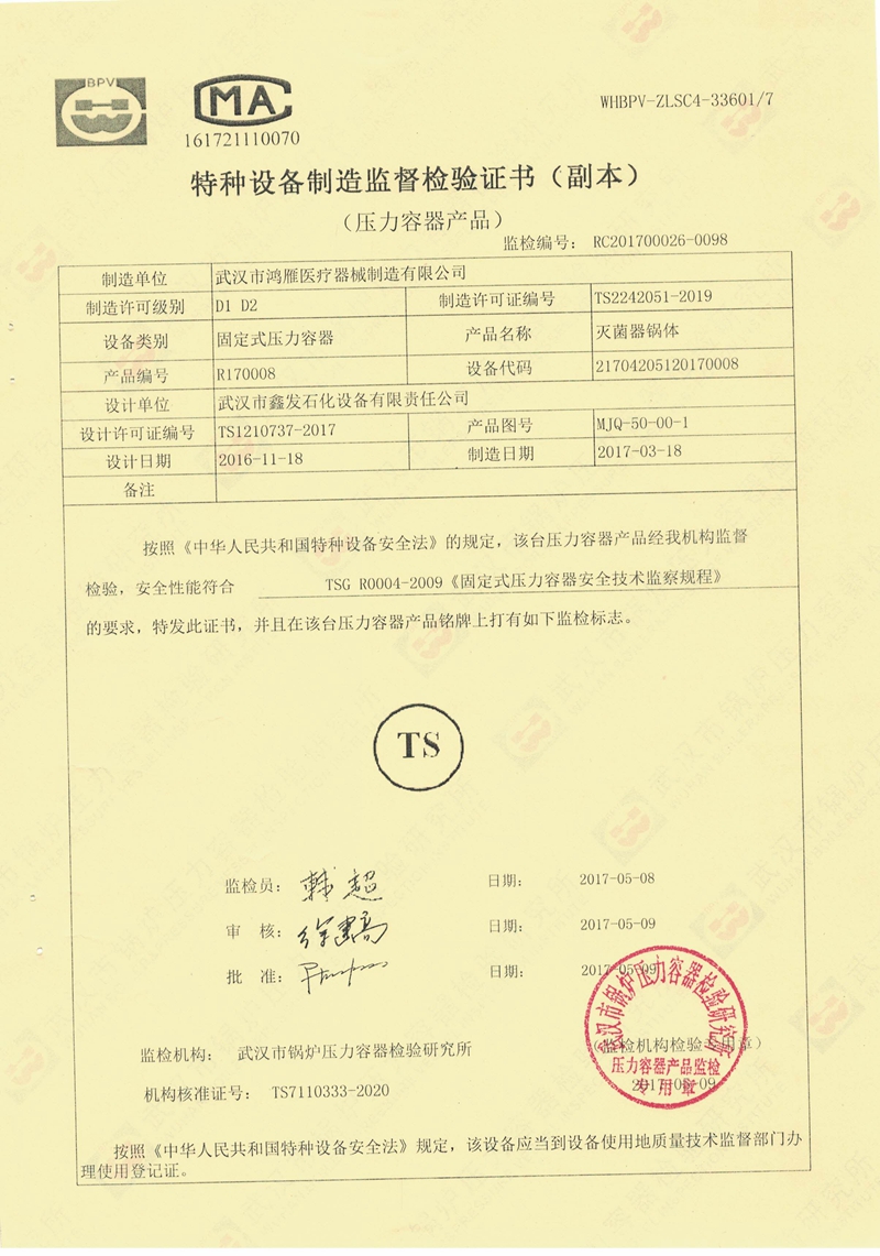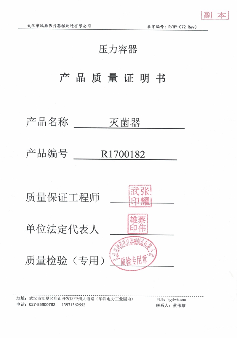 武漢市鴻雁醫療器械制造有限公司主要從事醫療器械、各規格壓力蒸氣滅菌器以及食品、環保等設備的制造。公司産品受鍋爐壓力容器檢驗研究院和食品藥品監督管理局雙重監檢,每台設備均有自己的身份銘牌。公司始終不渝地堅持科技興企、科學管理的方針,重視科技進步爲企業帶來的機會和效益,努力将新技術成果轉化爲産業優勢,秉持以品質穩定、産品革新、客戶滿意爲公司宗旨。與客戶共創雙赢的局面,分享各項成果,回饋社會。